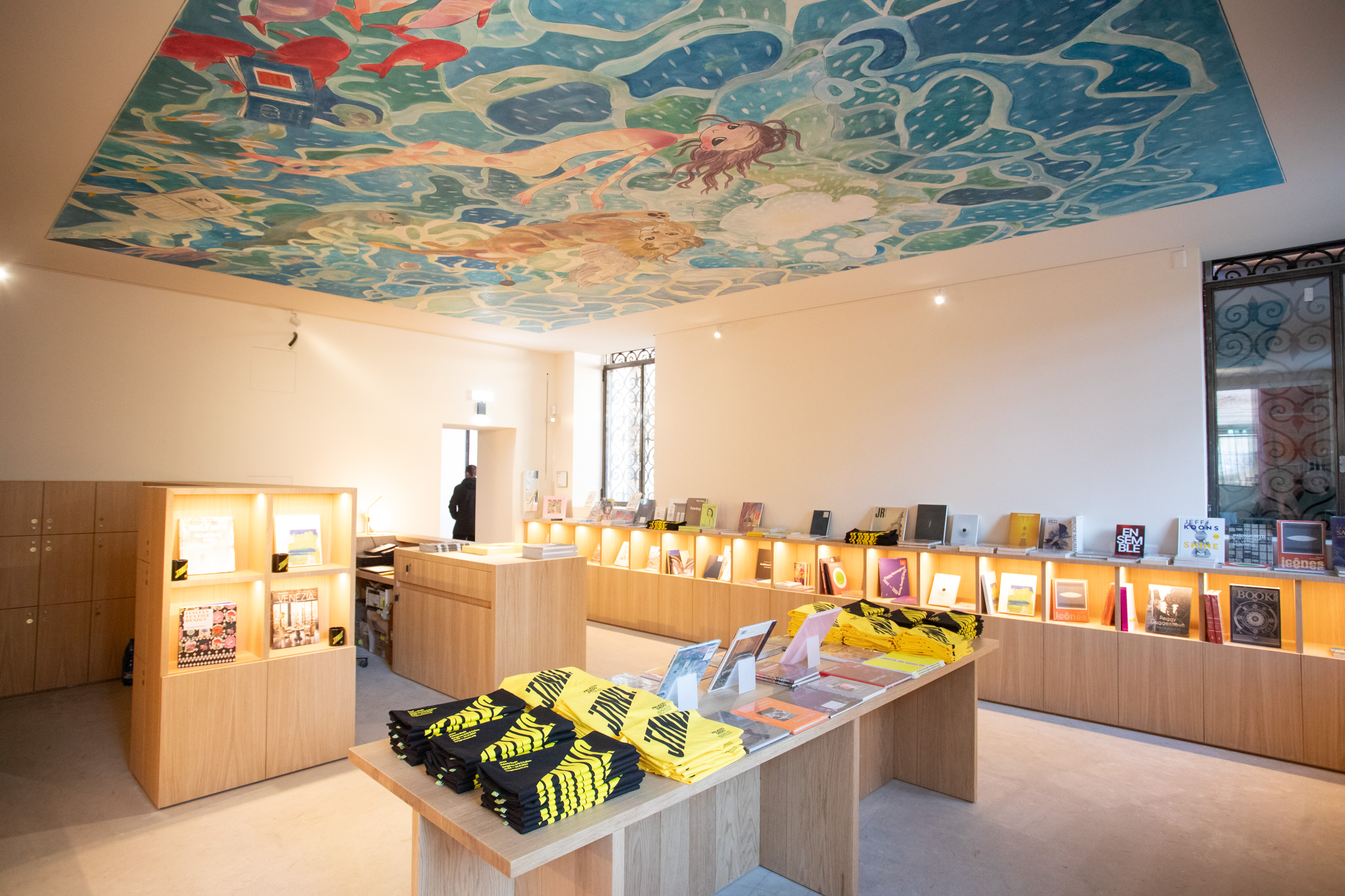 AYA TAKANO’s Happy and joyous days, a permanent work created for the Palazzo Diedo bookshop, is a ceiling painting made using the ancient fresco a giornate technique, taking its inspiration from Venice, the city of water. Unlike traditional frescoes that usually depict gods, angels, or dragons observing us from above, TAKANO’s piece flips the perspective: the viewer gazing upward finds themselves completely immersed in the Venetian sea, where a manga-style mermaid floats on the surface with a Venetian Lion and sea creatures, along with a copy of the book The Merchant of Venice adrift nearby.