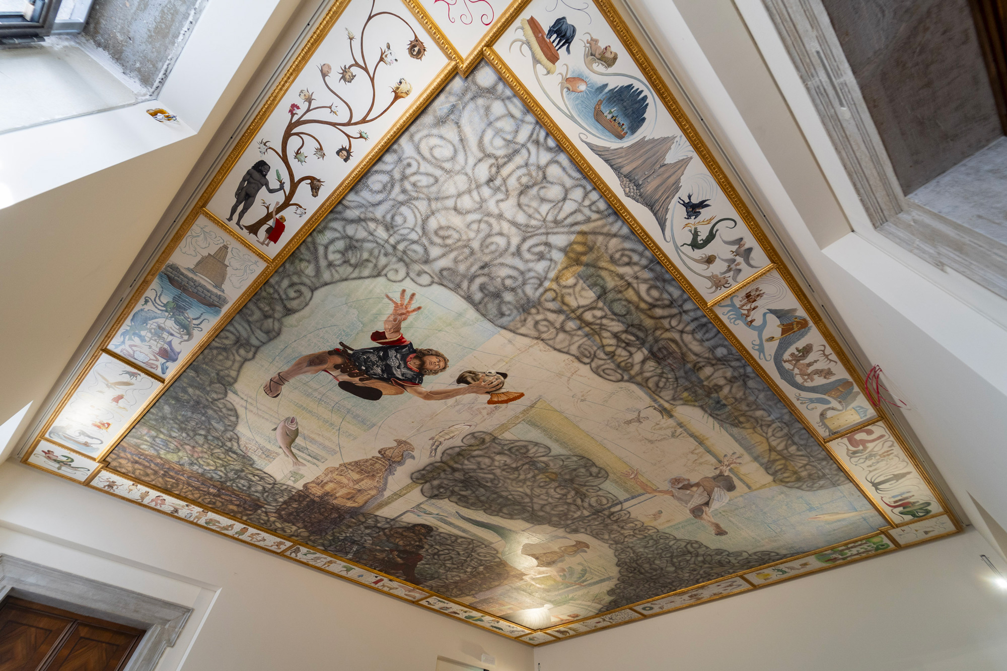 Taking inspiration from the myth of Alexander the Great, Jim Shaw produced a painting for the ceiling of Palazzo Diedo depicting Alexander’s anointment as the son of the God Amun in the temple at the Siwa Oasis, using an old Egyptian theater set canvas as the base. The central image, where his hyperrealist style overlaps with the original backdrop of the canvas, is surrounded by a frame of grotesques rich in symbols reminiscent of Bruegel. These symbols represent the mean and fantastical creatures that Alexander the Great during his quest to conquer the world.