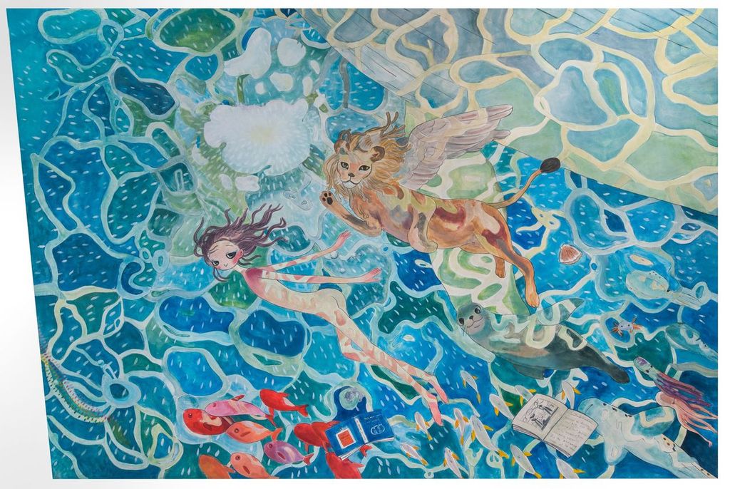 AYA TAKANO’s Happy and joyous days, a permanent work created for the Palazzo Diedo bookshop, is a ceiling painting made using the ancient fresco a giornate technique, taking its inspiration from Venice, the city of water. Unlike traditional frescoes that usually depict gods, angels, or dragons observing us from above, TAKANO’s piece flips the perspective: the viewer gazing upward finds themselves completely immersed in the Venetian sea, where a manga-style mermaid floats on the surface with a Venetian Lion and sea creatures, along with a copy of the book The Merchant of Venice adrift nearby.
