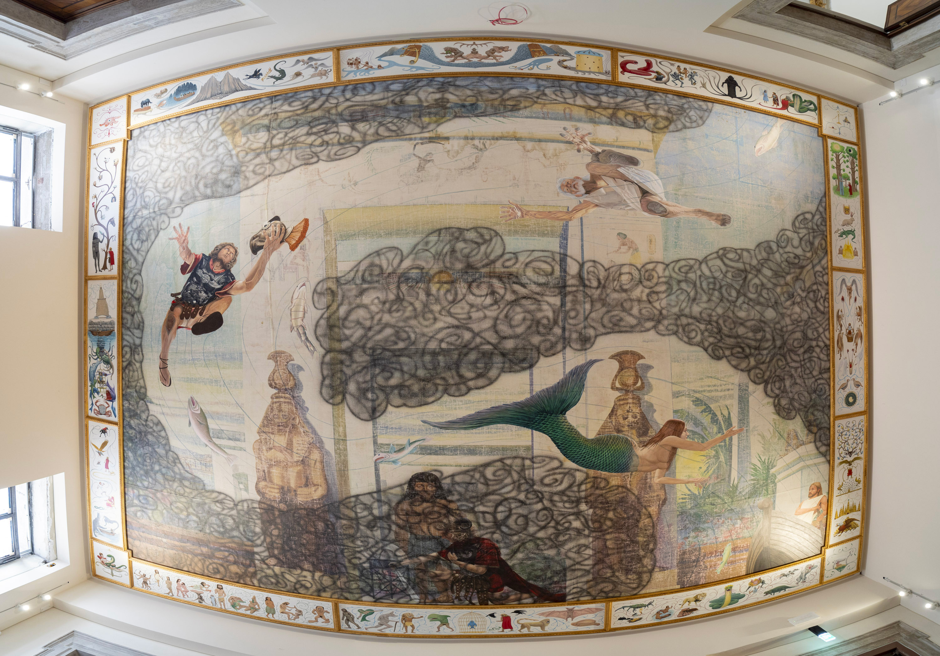 Taking inspiration from the myth of Alexander the Great, Jim Shaw produced a painting for the ceiling of Palazzo Diedo depicting Alexander’s anointment as the son of the God Amun in the temple at the Siwa Oasis, using an old Egyptian theater set canvas as the base. The central image, where his hyperrealist style overlaps with the original backdrop of the canvas, is surrounded by a frame of grotesques rich in symbols reminiscent of Bruegel. These symbols represent the mean and fantastical creatures that Alexander the Great during his quest to conquer the world.